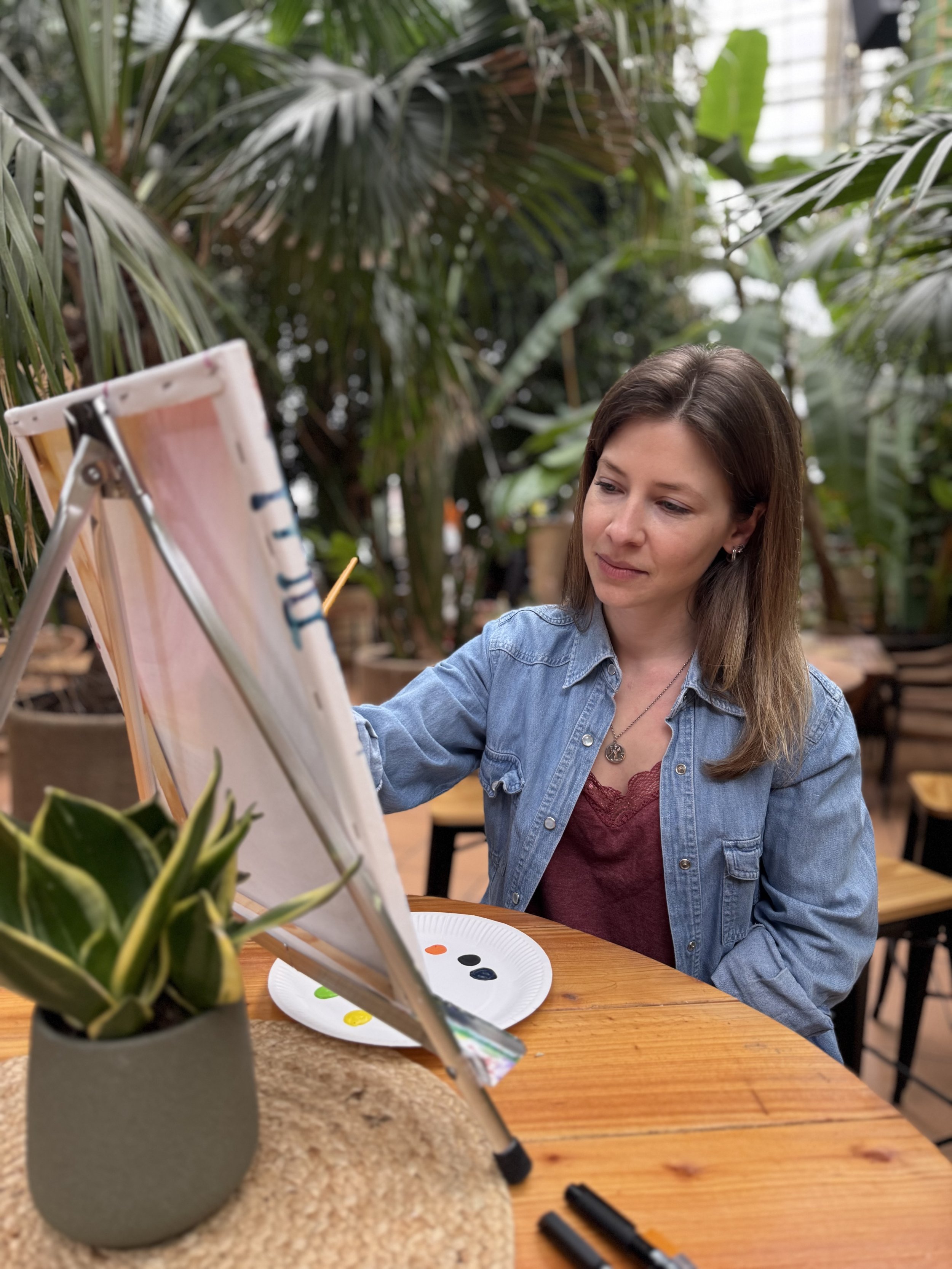 Im stimmungsvollen Setting des Restaurant Eden01 in Straubing – einem lichtdurchfluteten Glashaus zwischen Palmen und tropischen Pflanzen – verbinden wir Bewegung, Kreativität und Meditation zu einem runden Erlebnis.